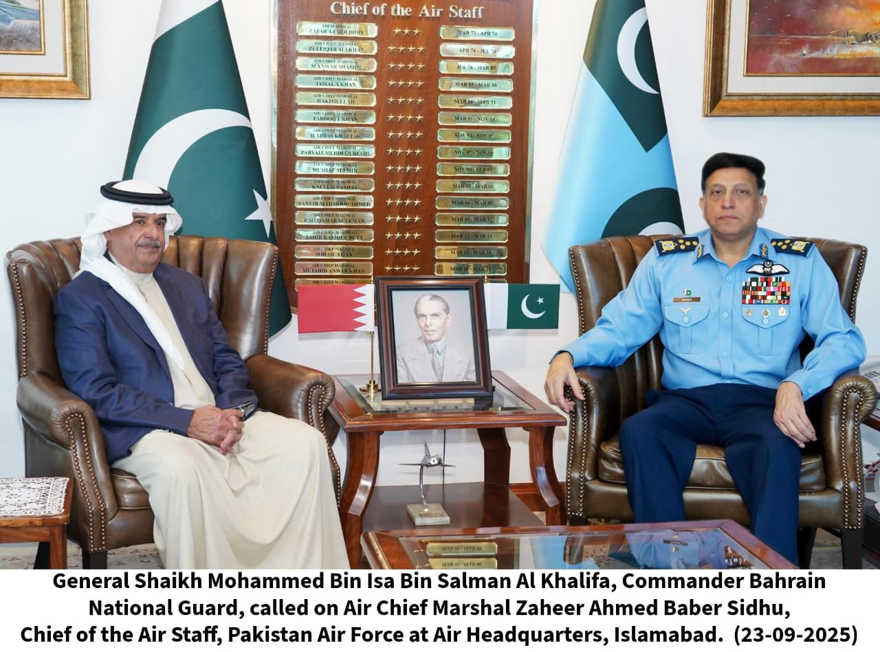 23 September, 2025: General Shaikh Mohammed Bin Isa Bin Salman Al Khalifa, Commander Bahrain National Guard, called on Air Chief Marshal Zaheer Ahmed Baber Sidhu, Chief of the Air Staff, Pakistan Air Force at Air Headquarters, Islamabad. During the meeting both sides reaffirmed their resolve for sustained defence cooperation, placing special emphasis on joint training initiatives and deeper collaboration within the aviation industry.