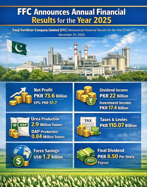 Islamabad, January 29, 2026: Fauji Fertilizer Company Limited (FFC) has announced its financial results for the year ended December 31, 2025, following a meeting of its Board of Directors held on January 29, 2026.
