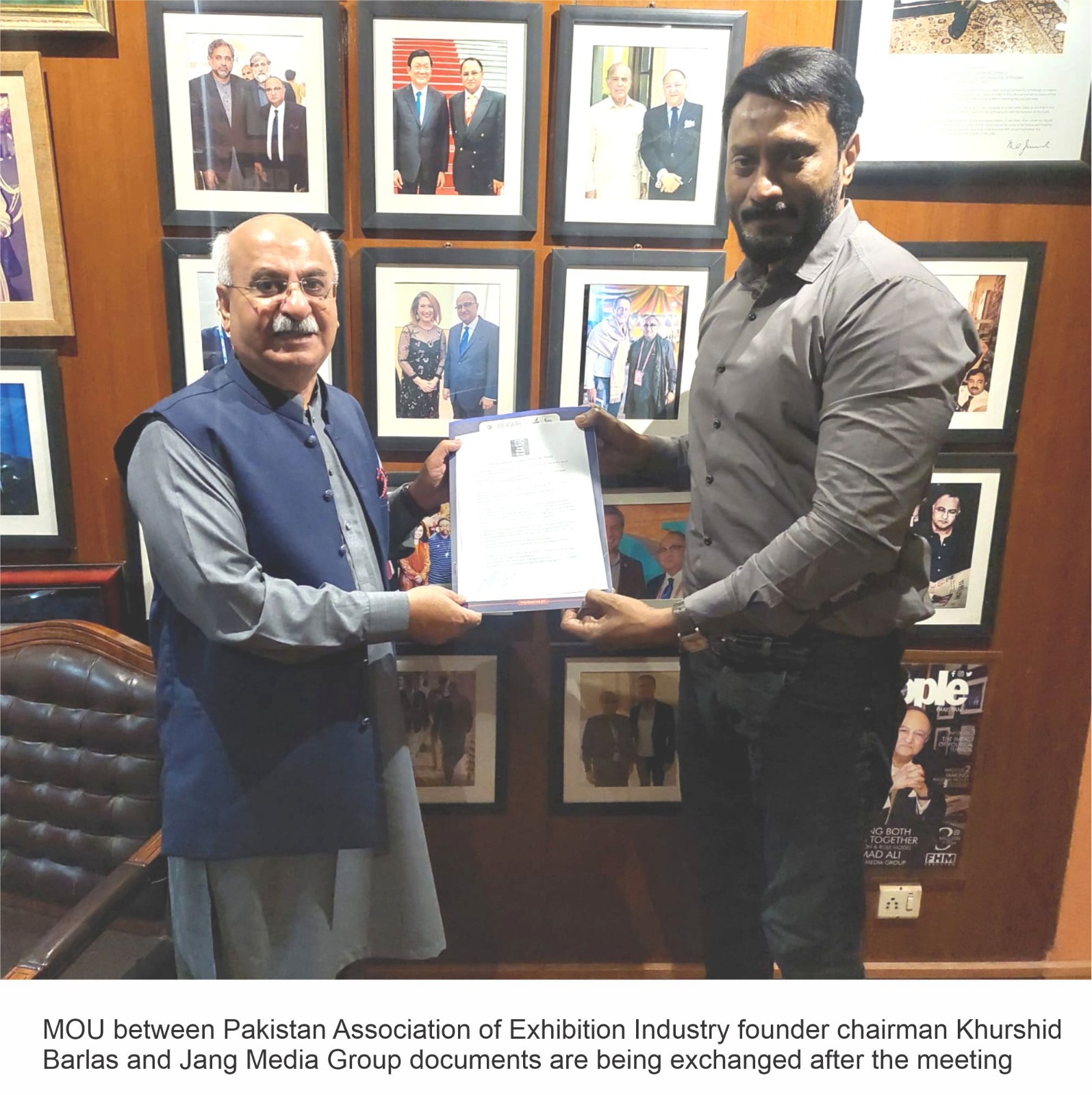 A detailed briefing was given about the 8th Pakistan International Property Expo and Tourism Investment Summit Karachi between Pakistan Association of Exhibition Industry and Jang Media Group. Sarmad Ali and Khurshid Barlas signed an MOU document under which Jang will be a part of this exhibition as a media partner.
