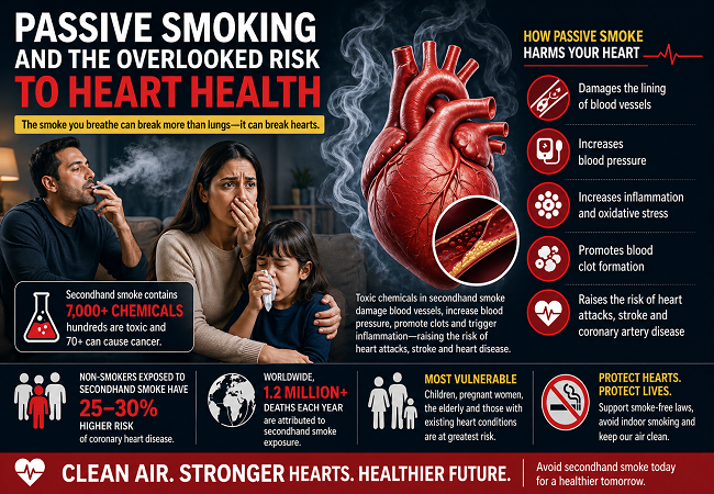 The biological link between secondhand smoke and heart disease is well established. Smoke exposure contributes to endothelial dysfunction, increases blood clotting tendency and promotes inflammation. These processes accelerate atherosclerosis and raise the probability of acute cardiac events. For individuals with pre-existing cardiovascular vulnerability, passive smoke can act as a trigger that exacerbates underlying risk.