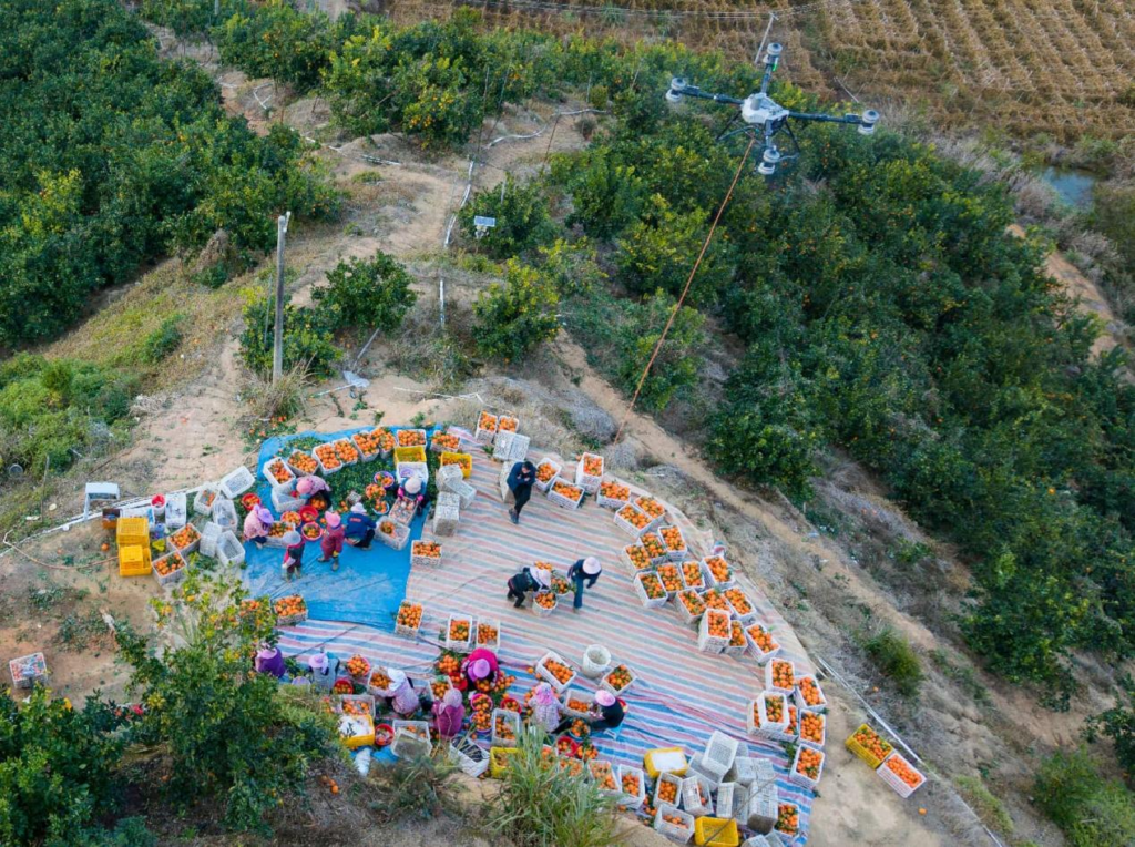 A drone transports freshly picked navel oranges from an orchard in Meizhou, south China’s Guangdong province. (Photo/Feng Xiquan)