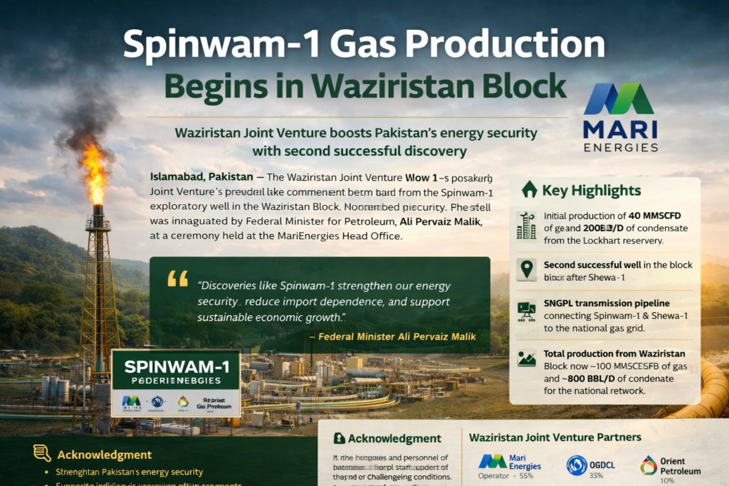 Islamabad, Pakistan — In a significant development for Pakistan’s energy sector, Spinwam-1 gas production has officially commenced in the Waziristan Block, Khyber Pakhtunkhwa, marking a major milestone in indigenous resource development.