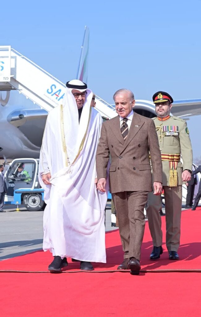 Prime Minister Shehbaz Sharif along with Deputy Prime Minister and Foreign Minister Ishaq Dar and Chief of Defence Forces Field Marshal Syed Asim Munir warmly received President of UAE Mohamed bin Zayed Al Nahyan at the Nur Khan Airbase. Key cabinet members and senior officials were also present on the occasion.